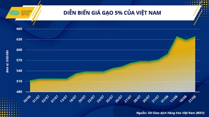 Theo Hiệp hội Lương thực Việt Nam, ngày 21/8, giá gạo xuất khẩu 5% tấm của nước ta đang ở mức 638 USD/tấn, cao hơn 10 USD so gạo Thái Lan cùng loại. Giá gạo 25% tấm của Việt Nam ở mức 623 USD/tấn, cao hơn nhiều so gạo cùng loại của Thái Lan là 563 USD/tấn.