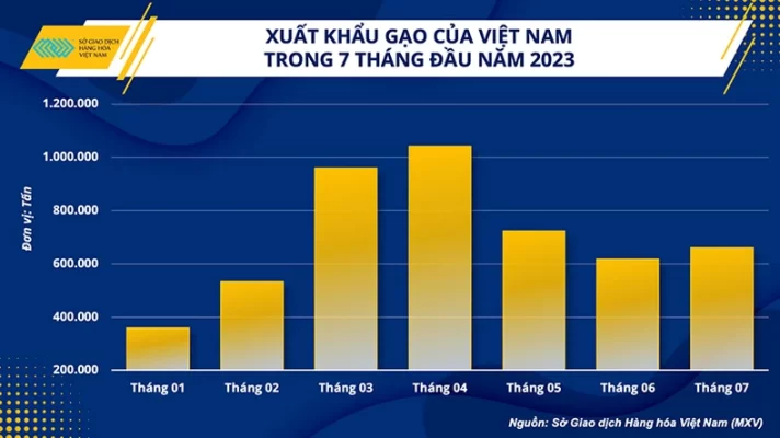 Theo số liệu sơ bộ từ Tổng cục Thống kê Việt Nam, nước ta đã xuất khẩu 660.738 tấn gạo trong tháng 7, cao hơn 6,9% về lượng và 6,4% về giá trị so tháng trước. Lũy kế trong 7 tháng đầu năm 2023, xuất khẩu gạo của nước ta đạt mức 4,89 triệu tấn, cao hơn 20,1% so cùng kỳ năm ngoái.